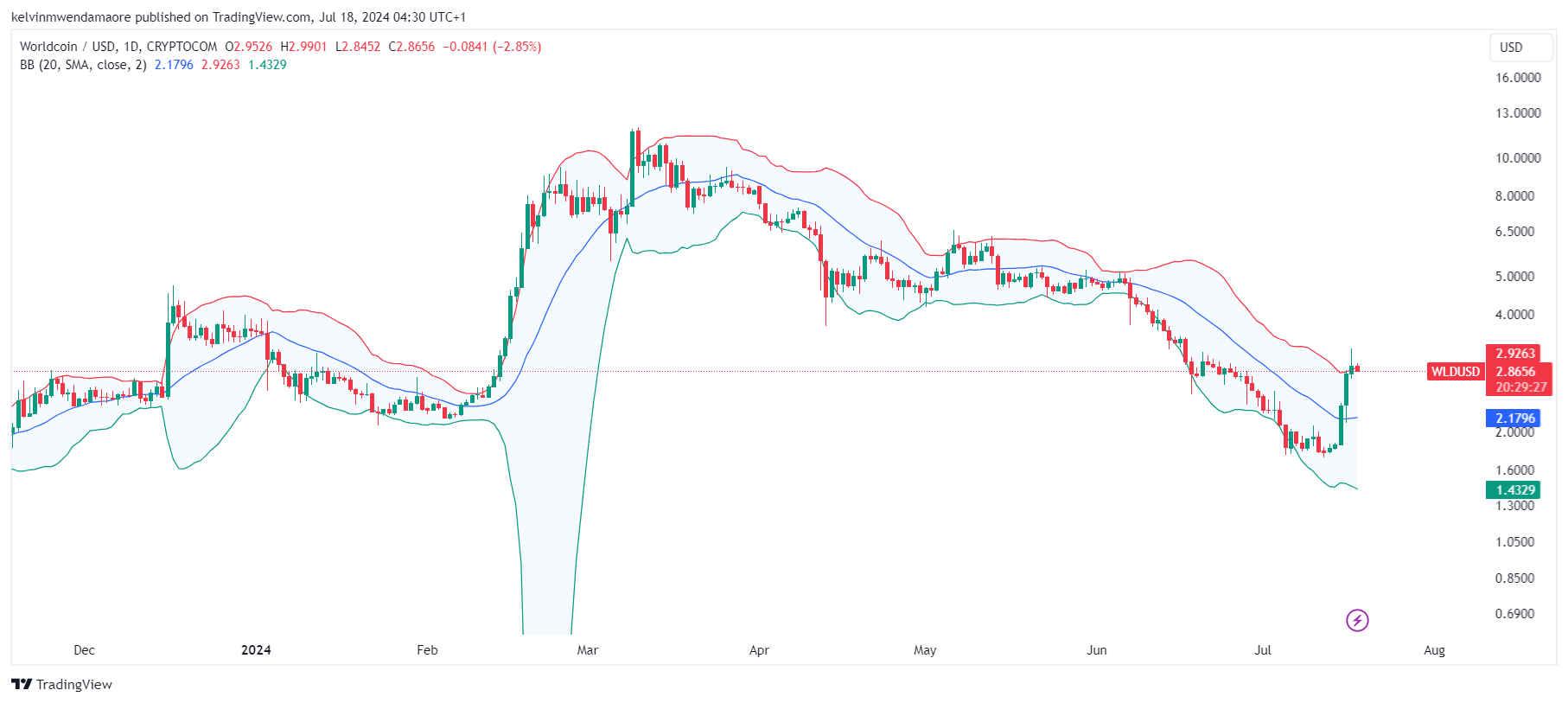 - Ценовой анализ Worldcoin (WLD) – полосы Боллинджера