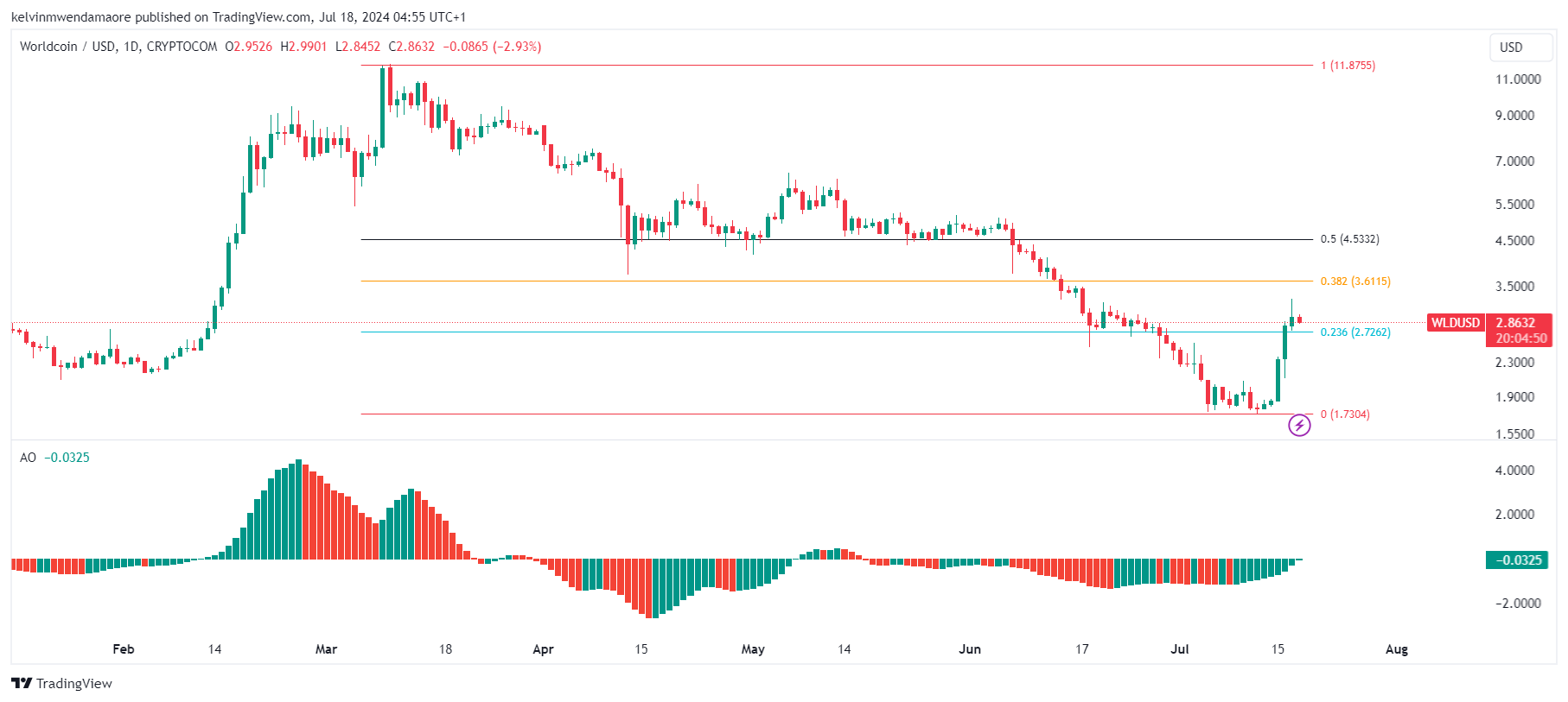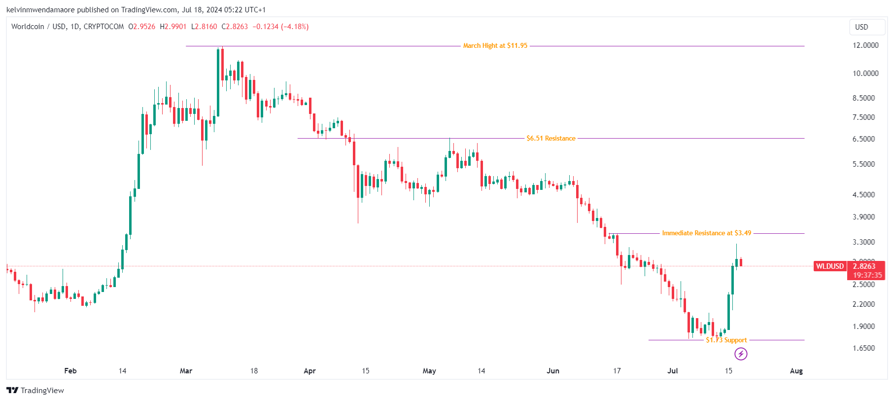 На 1-дневном графике WLD/USD видна сильная поддержка на уровне $1,73, что создает условия для значительного ралли. Цена WLD выросла вместе с этой основой, прицелившись к ближайшему барьеру на уровне 3,49 доллара.