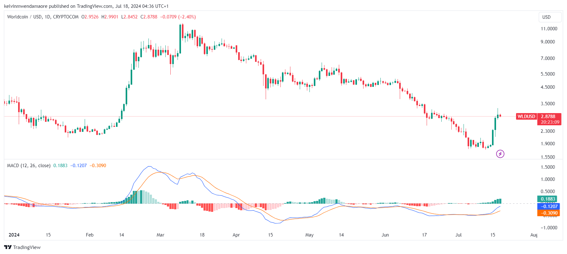Этот всплеск поднимает Worldcoin на 88-е место в рейтинге рыночной капитализации, усиливая его растущую известность. Более того, цена WLD выросла на 4,38% за последний месяц, что указывает на то, что он может стать надежным активом, если эта положительная тенденция сохранится. Все эти факторы указывают на устойчивую восходящую тенденцию для WLD.