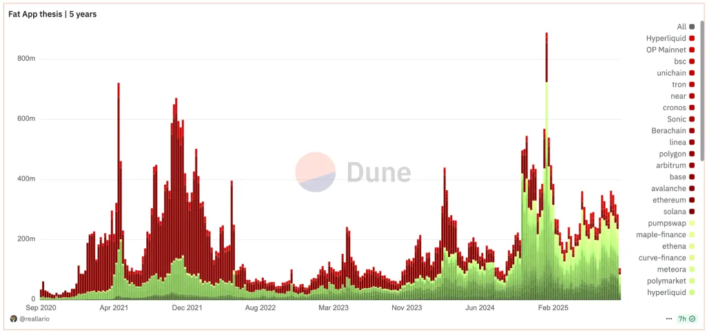 «Наиболее взрывной рост показывают именно приложения, а не протоколы. Яркий пример — Hyperliquid. HYPE вошел в число токенов с самой высокой доходностью на крипторынке», — отметили эксперты.