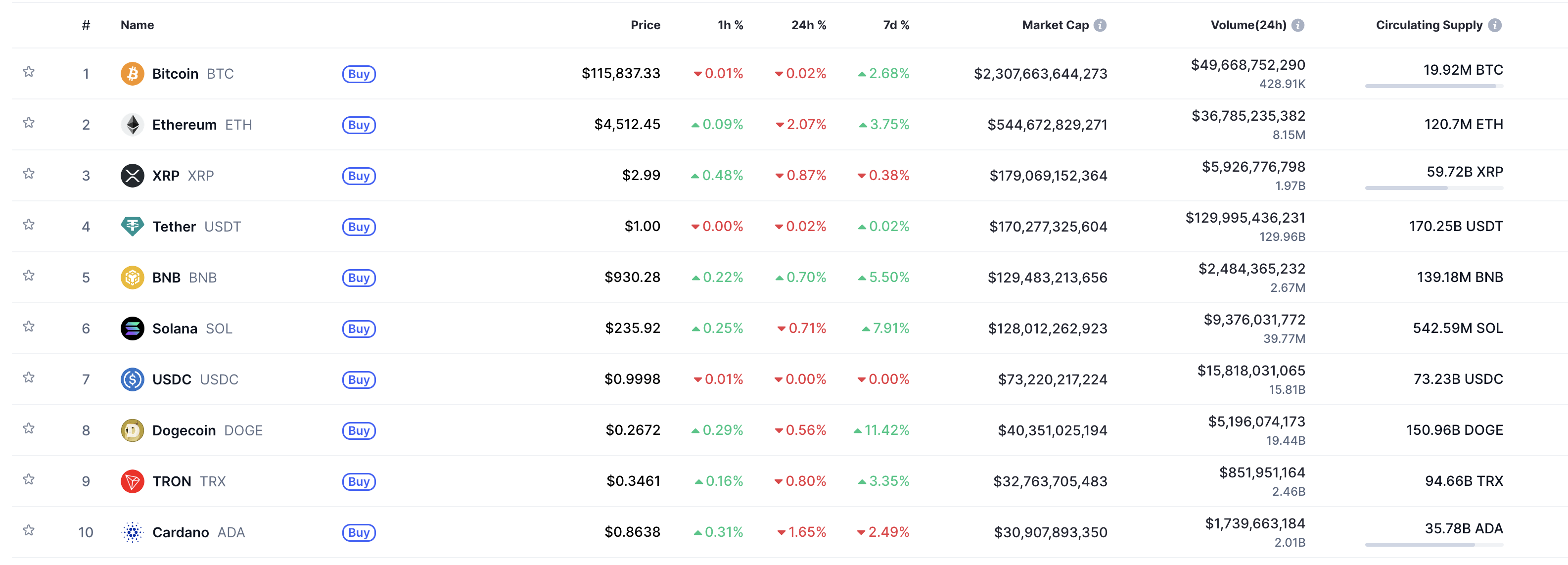 По данным CoinMarketCap, на момент написания биткоин торгуется по $115 837. За сутки главная криптовалюта почти не изменилась в цене, а за неделю подешевела на 2,68%.