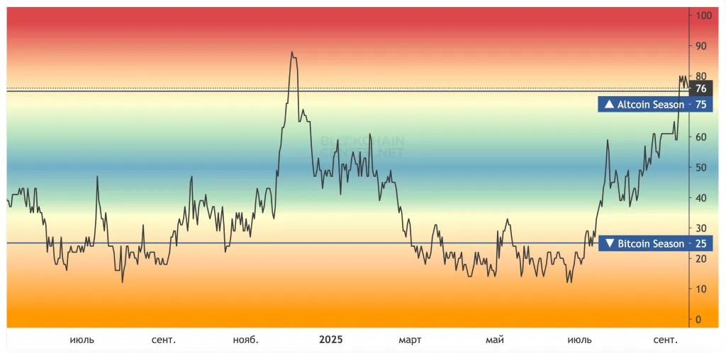 Аналогичная картина наблюдается на графике Altcoin Season Index от CoinGlass, который 15 сентября вырос до 80 пунктов.