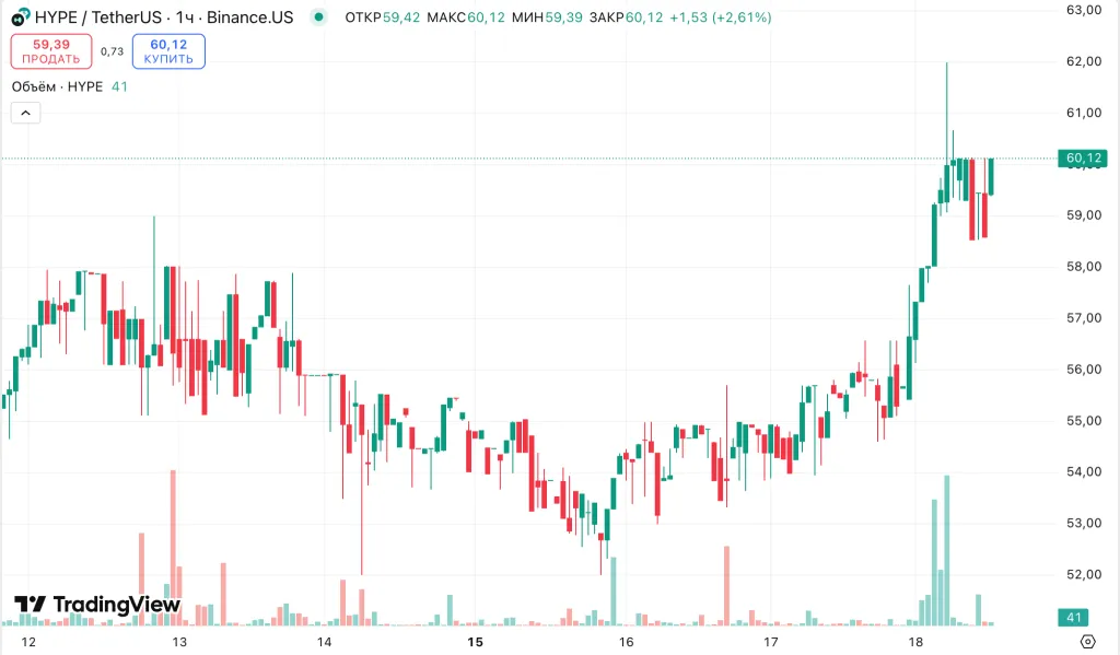 Курс монеты HYPE от децентрализованной биржи Hyperliquid подскочил на 7%, достигнув рекордного уровня $60.