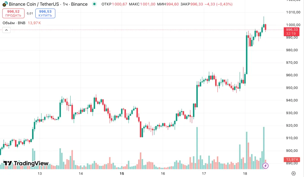 Тем временем BNB впервые в истории превысил отметку $1000. Ранее СМИ сообщили, что Binance ведет переговоры с Минюстом США о выходе из-под надзора властей США.