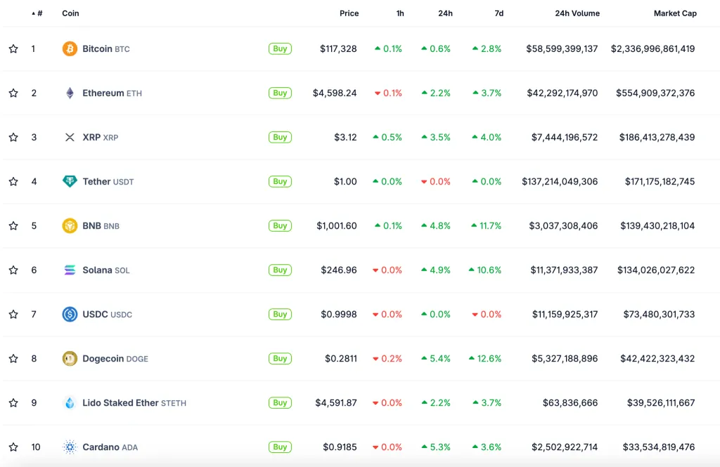 Биткоин поднялся на 0,4%, продолжая торговаться на уровне $117 000. Цена Ethereum увеличилась на 2%, до $4600.