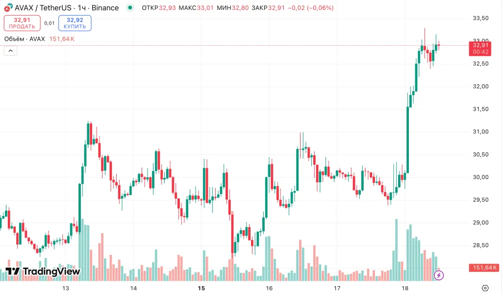 Согласно CoinGecko, наибольший прирост среди крупнейших по капитализации криптовалют показал Avalanche (AVAX), цена которого выросла почти на 10% за последние сутки — до $32,9.