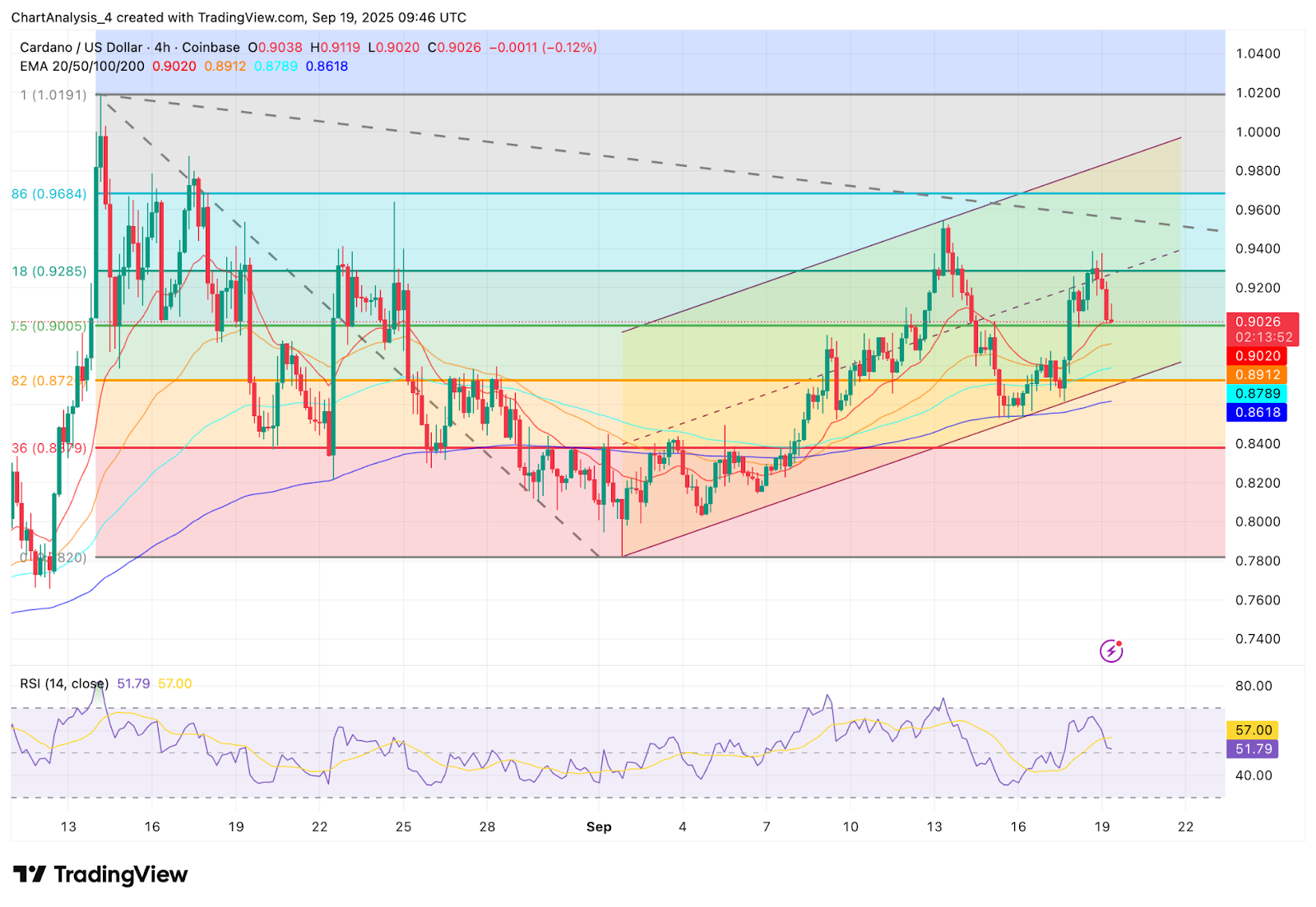На 4-часовом графике ADA движется в восходящем канале, верхняя граница которого ограничила рост на уровне $0,92. Покупатели защищают кластер EMA между $0,90 и $0,89, который служит точкой опоры для краткосрочного импульса.
