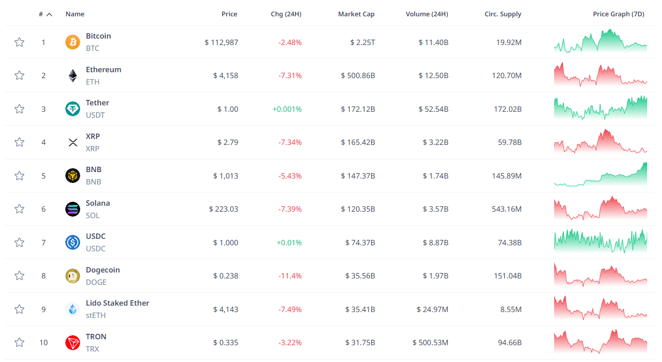 На момент подготовки материала курс биткоина частично восстановился. Актив торгуется чуть ниже $113 000. На суточном чарте просадка составляет 1,86%: