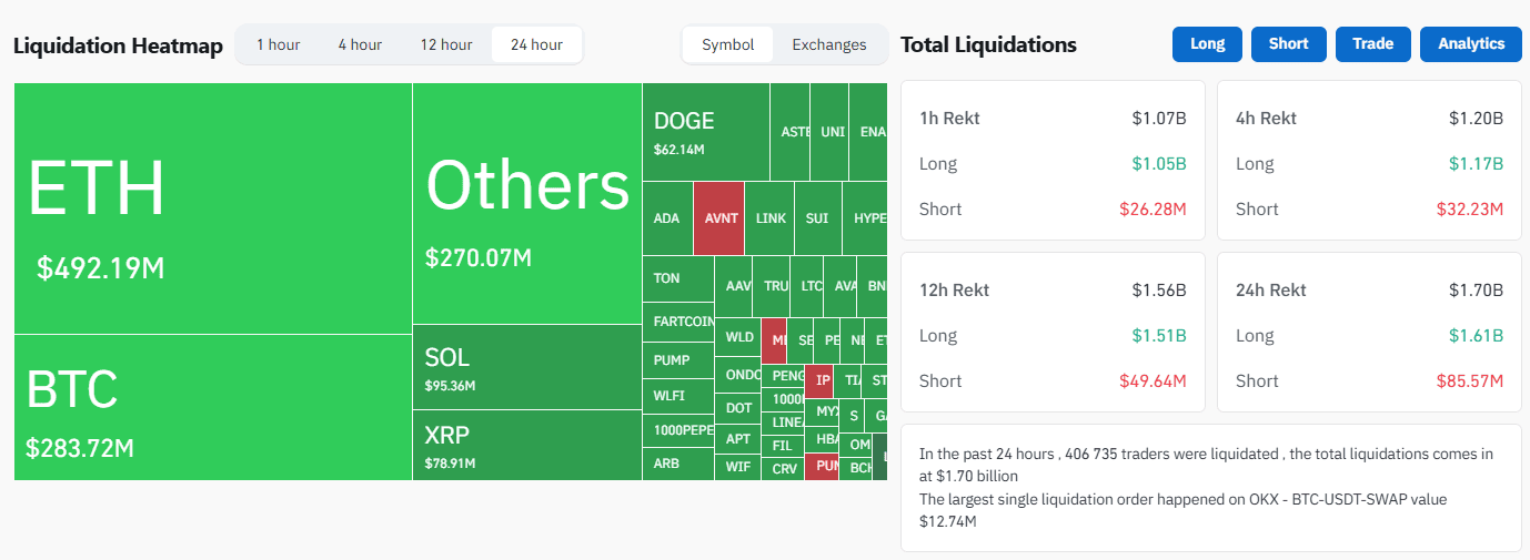 - Объем ликвидаций превысил $1 млрд за час, и $1,7 млрд — за сутки.