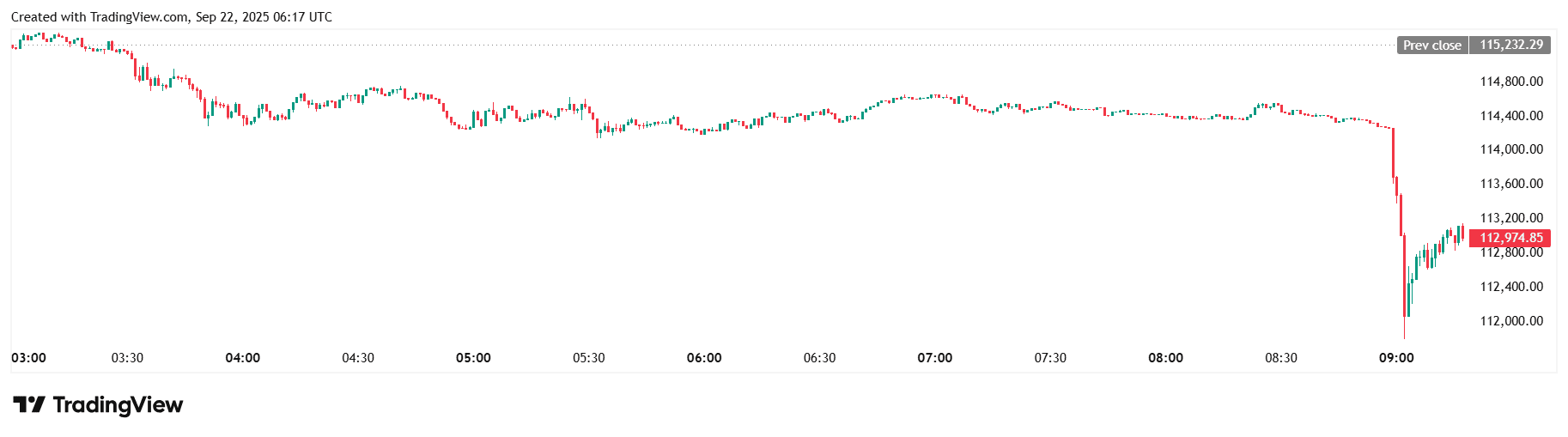 Утром 22 сентября 2025 года курс биткоина в моменте обвалился до $111 800, согласно TradingView. На фоне этого объем ликвидаций по фьючерсным контрактам за час составил более $1 млрд, и практически все это потери по длинным позициям.