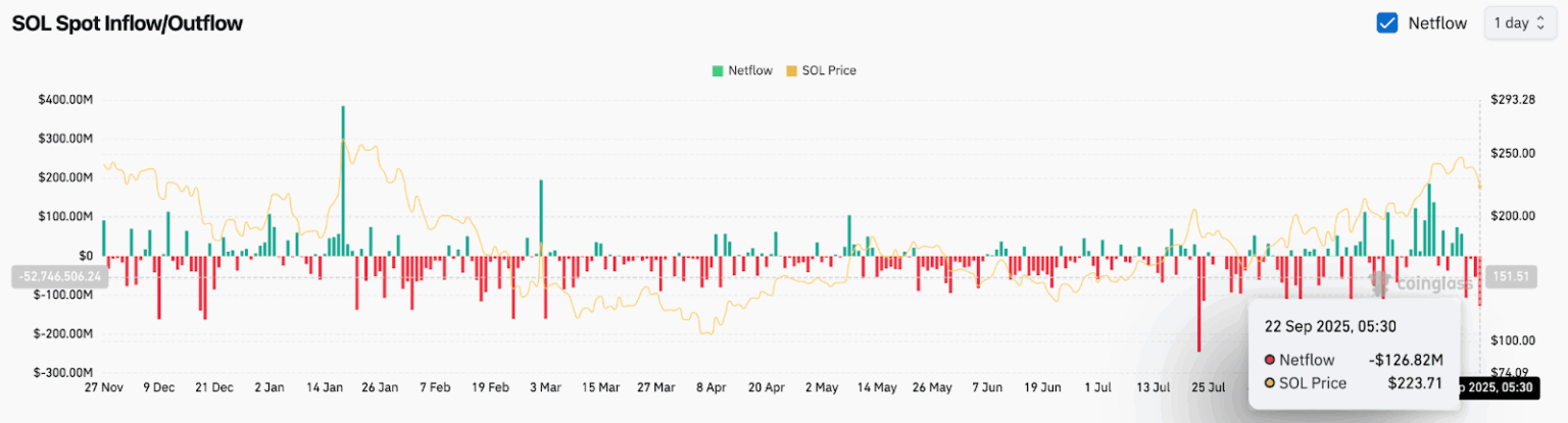 Данные о блокчейне подтверждают давление со стороны спотового рынка. 22 сентября Coinglass сообщила о чистом оттоке в размере 126,8 млн долларов США, что стало одним из крупнейших однодневных выводов за последние недели. Постоянные продажи совпадают с откатом цены от отметки 252 доллара США, что говорит о том, что киты и крупные держатели, возможно, сокращают свои позиции после сильного роста на 150% с начала года.