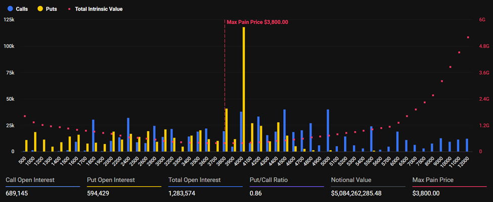 Точка максимальной боли для $ETH — $3 800. При этом сам актив недавно упал ниже психологически важного уровня $4 000 и сейчас торгуется около $3 963. Такая динамика усиливает риски дополнительного давления на цену в случае пробоя поддержки.