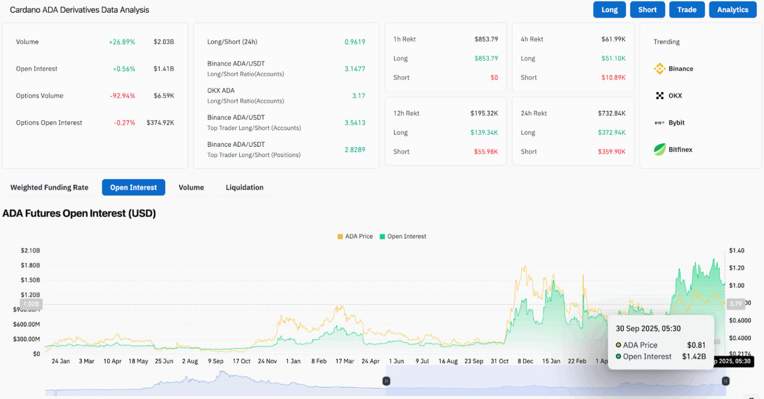 Потоки деривативов демонстрируют возобновление активности. Открытый интерес к Cardano составляет $1,41 млрд, увеличившись на 0,56% за последние 24 часа, а объём торгов вырос на 26% до $2,03 млрд. Соотношение длинных и коротких позиций на Binance имеет сильный бычий уклон и составляет 3,14, что свидетельствует о том, что кредитное плечо склоняется в сторону ставок на повышение.
