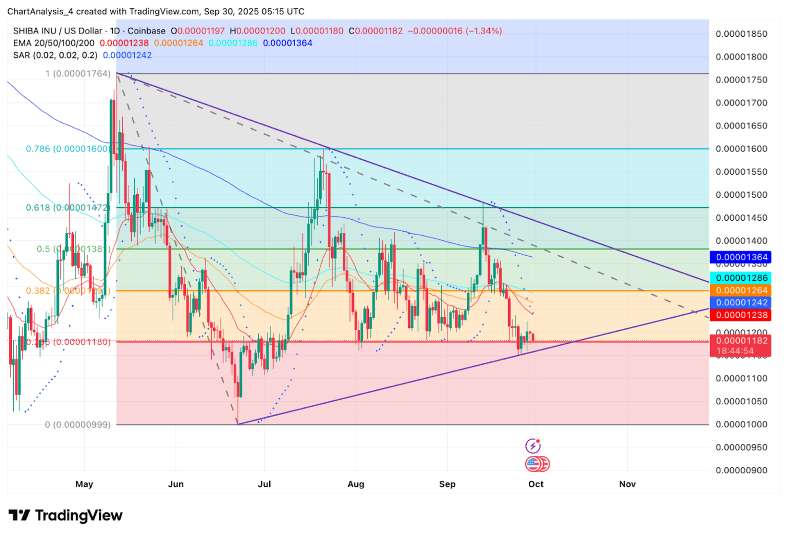 На дневном графике SHIB зажат между сужающимся треугольником с поддержкой на уровне $0,00001180 и нисходящим сопротивлением вблизи $0,00001360. Цена неоднократно отскакивала от этой базы с середины сентября, что указывает на накопление.