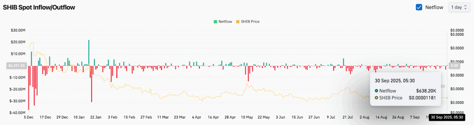 Данные о чистом потоке средств на бирже показывают, что 30 сентября SHIB зафиксировал скромный приток в размере 638 000 долларов, что прервало несколько недель устойчивого оттока. Хотя этот показатель недостаточен для того, чтобы свидетельствовать о широкой уверенности, он указывает на то, что некоторые инвесторы готовятся к исторической волатильности в октябре.