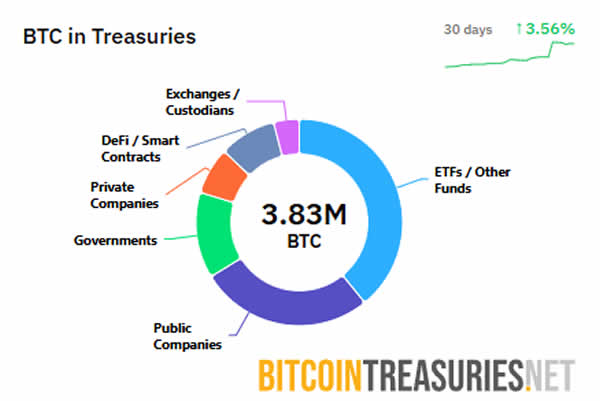 По данным BitcoinTreasuries.NET, в настоящее время в государственных и частных корпоративных казначействах хранится более 1,3 млн BTC на сумму около 157,7 млрд долларов, что составляет 6,6 % от общего объёма в обращении.