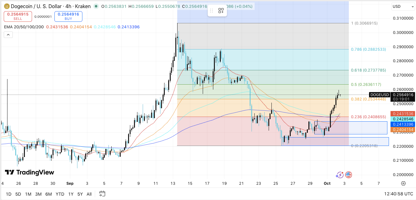 Текущая стоимость DOGE составляет $0,2564, что позволяет ему находиться чуть выше уровня коррекции Фибоначчи 0,382 на уровне $0,2534. Эта зона теперь служит непосредственной поддержкой. Восстановление началось после резкого отскока от уровня $0,22, который совпал с уровнем коррекции Фибоначчи 0,236.