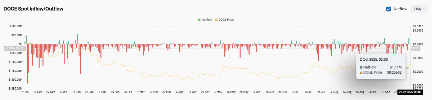 Эти изменения указывают на частую фиксацию прибыли и устойчивое давление со стороны крупных держателей. Однако последние данные от 2 октября показали чистый приток в размере 1,11 млн долларов, поскольку DOGE торговался около 0,256 доллара.