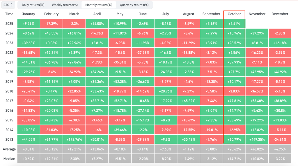Сезонность тоже имеет значение. В криптосообществе октябрь получил прозвище Uptober: исторически в этом месяце биткоин почти всегда показывал положительную доходность, в среднем около 20,6%.