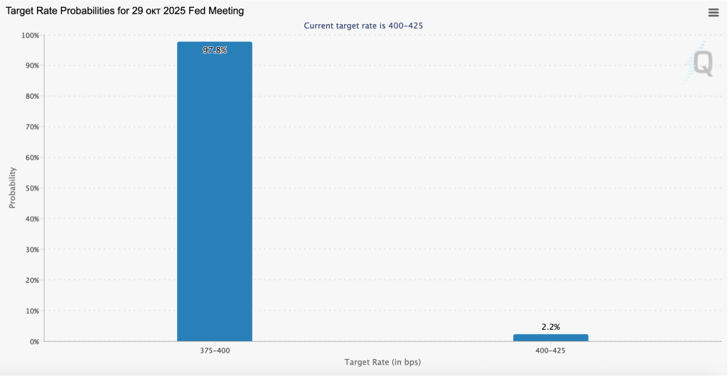 Позитивный настрой также усиливается ожиданиями второго снижения ключевой ставки ФРС в октябре. Почти 98% участников рынка ставят на дальнейшее смягчение денежной политики.