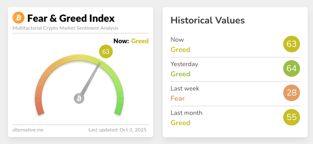 Индекс страха вернулся в зону «жадности», сигнализируя о преобладающих среди инвесторов бычьих настроениях.