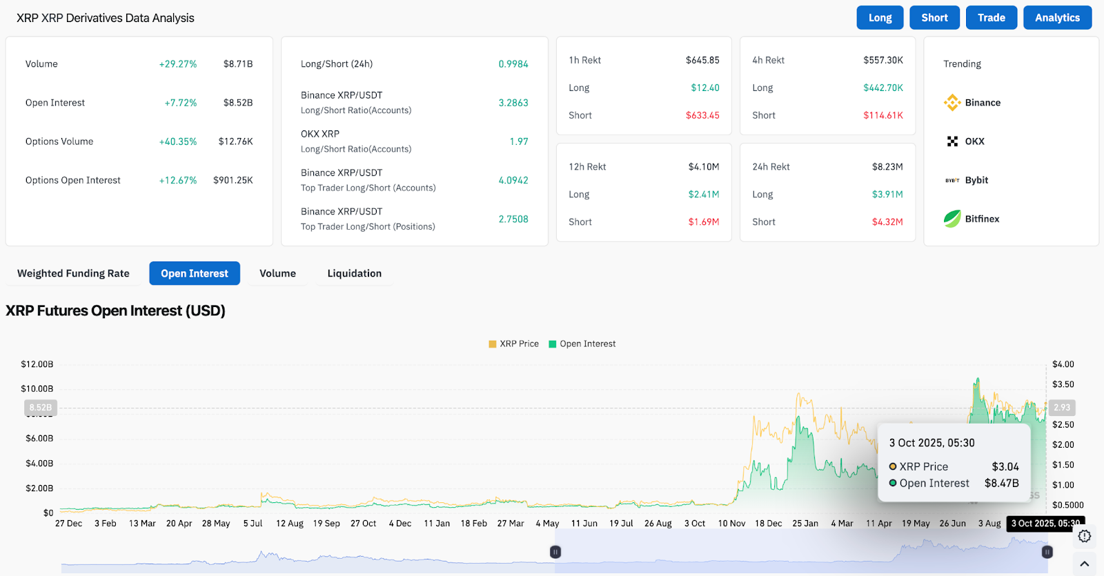 На рынках деривативов XRP наблюдается возобновление активности. Открытый интерес к фьючерсам вырос до 8,52 млрд долларов США, увеличившись на 7,7% за 24 часа, а объём торгов увеличился на 29% до 8,71 млрд долларов США. Активность на рынке опционов также резко возросла: открытый интерес вырос более чем на 12% до 901 000 долларов США.