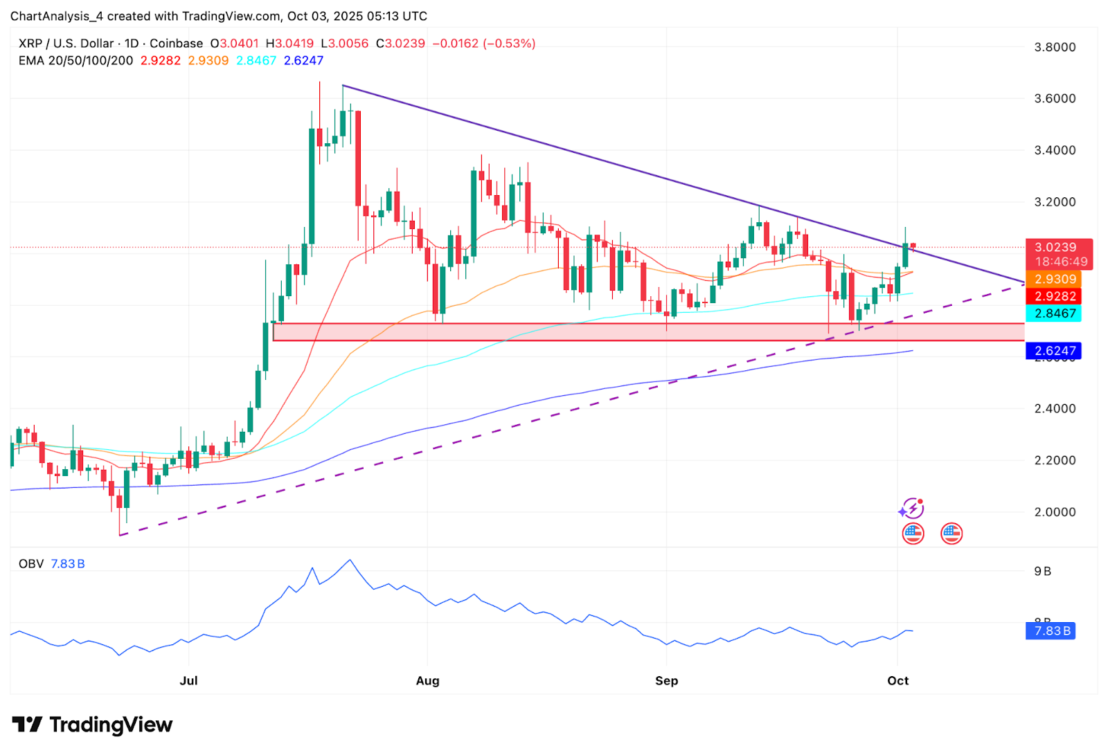 - Цена XRP консолидируется около $3,02, а быки ожидают прорыва $3,20 выше нисходящего треугольника.