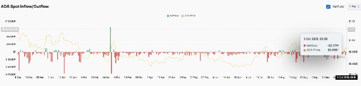 Данные о притоке и оттоке средств на спотовом рынке дают дополнительную информацию. В последние месяцы наблюдается устойчивый чистый отток средств, что указывает на то, что инвесторы выводят средства из ADA с бирж. 3 октября чистый отток средств из ADA составил 2,37 млн долларов США.