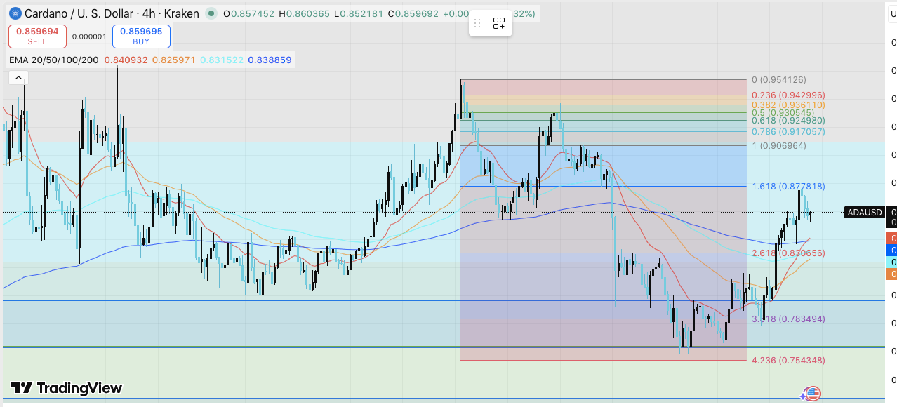Покупатели недавно подтолкнули ADA к уровню расширения Фибоначчи 1,618 на уровне $0,878, где она столкнулась с сопротивлением и немного откатилась. Этот отскок отражает растущий оптимизм трейдеров и инвесторов, внимательно следящих за ключевыми техническими уровнями.