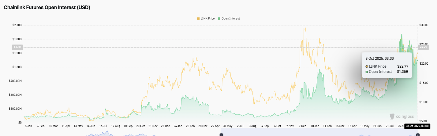 Помимо ценовой динамики, в течение 2025 года наблюдался резкий рост открытого интереса к фьючерсам Chainlink. С июля открытый интерес вырос с предыдущих диапазонов в 300–600 млн долларов США и к началу октября превысил 1,3 млрд долларов США.