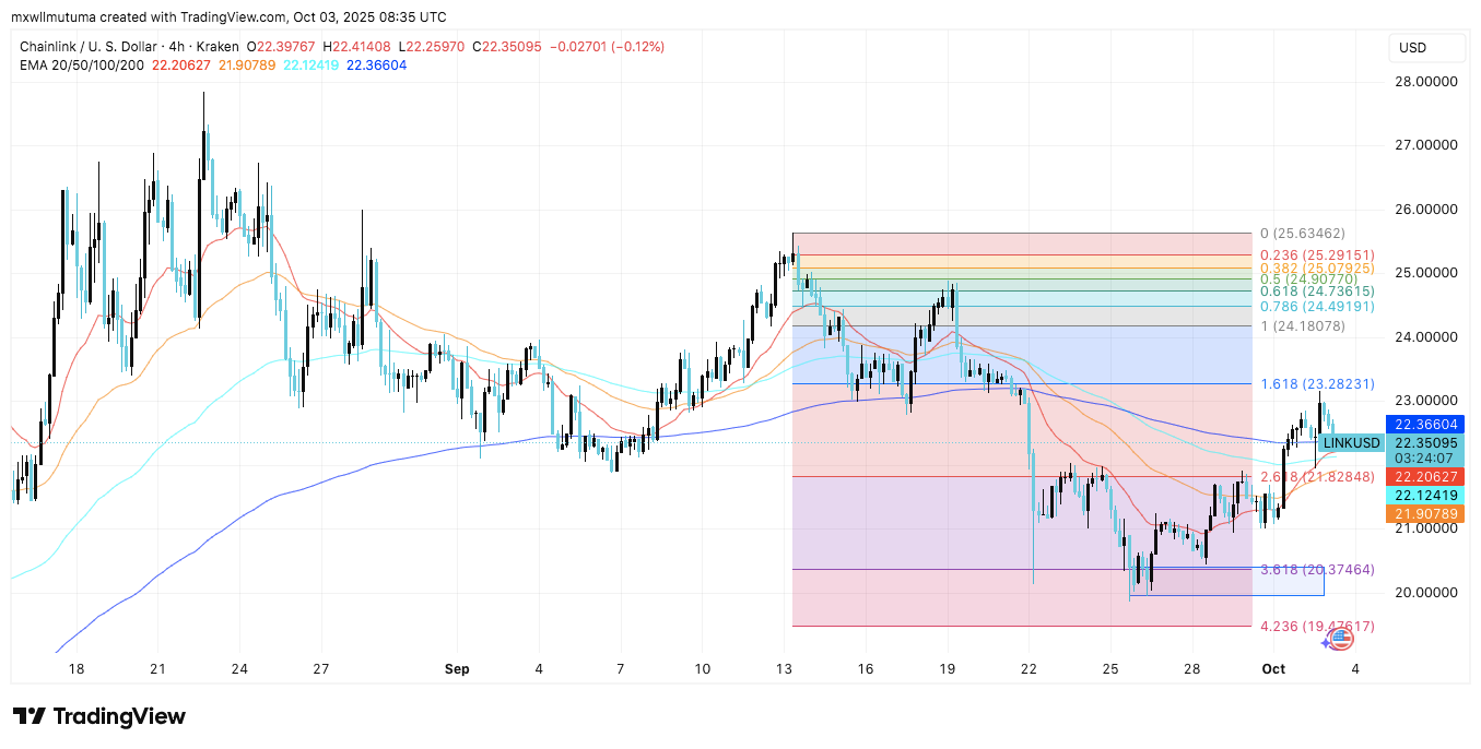Chainlink (LINK) в последнее время привлекает повышенное внимание, поскольку его цена демонстрирует краткосрочный восходящий тренд после минимума около $20,37. Криптовалюта отскочила выше ключевых скользящих средних, включая 50-дневную экспоненциальную скользящую среднюю (EMA) в районе $22,12 и 100-дневную экспоненциальную скользящую среднюю (EMA) в районе $22,36, что сигнализирует о возобновлении бычьего импульса.