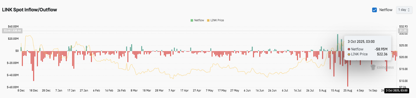 Однако, несмотря на рост цен, в течение 2025 года LINK столкнулся с устойчивым чистым оттоком средств с бирж. Несколько раз, особенно в середине августа и конце сентября, объемы скачков превышали 40 миллионов долларов, в то время как приток оставался ограниченным.
