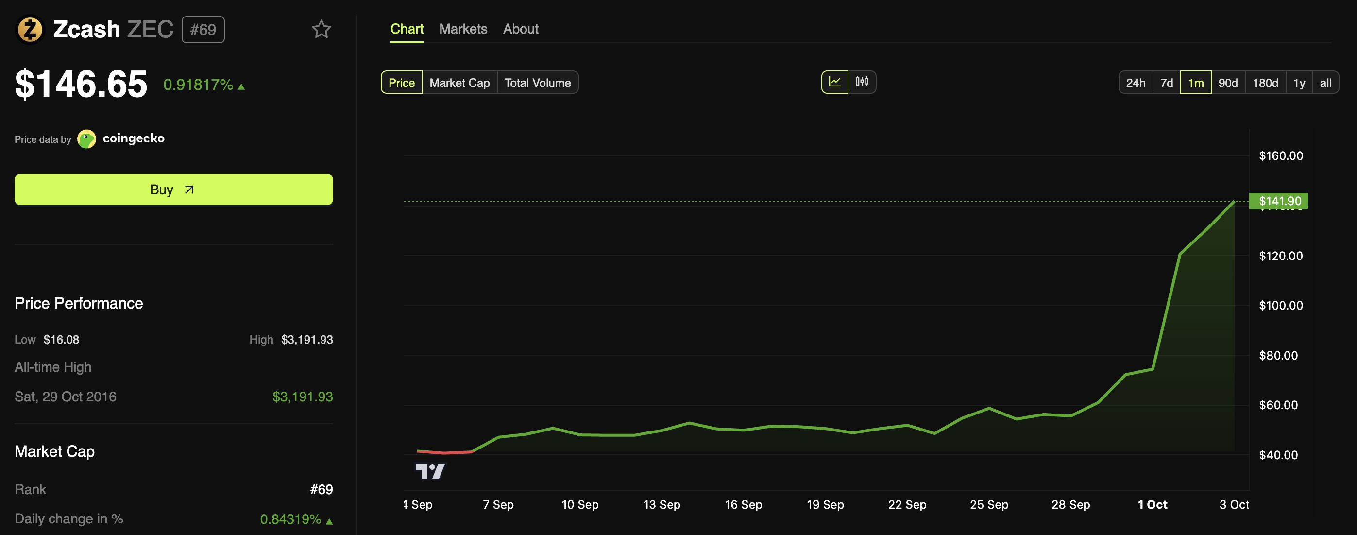 Катализатором стал запуск Grayscale Zcash Trust, который позволил аккредитованным инвесторам получить доступ к активу без прямого владения токенами, что увеличило спрос. На момент написания приватная монета торговалась по $146,65 с ростом на 0,918% за последние сутки.