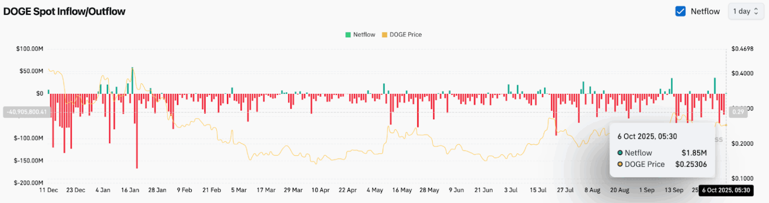 Данные Coinglass показывают, что 6 октября Dogecoin зафиксировал положительный чистый приток в размере 1,85 млн долларов, что свидетельствует о резком улучшении ситуации после нескольких дней умеренного оттока. Данные указывают на небольшое накопление средств розничными держателями по мере стабилизации цен выше 0,25 доллара.