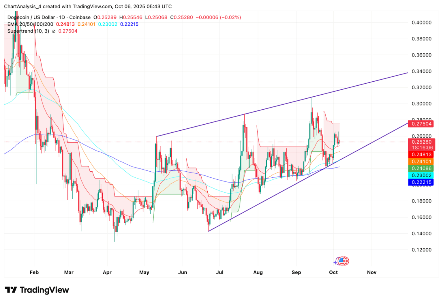- Dogecoin консолидируется в восходящем канале с уровнем поддержки $0,24 и сопротивлением около $0,275.