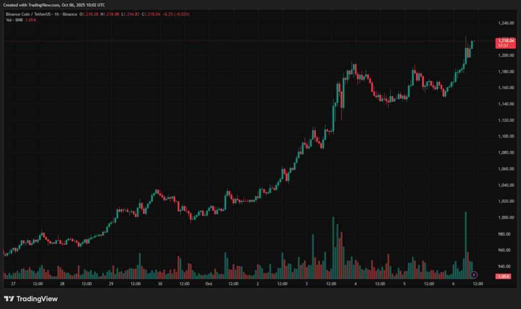 6 октября 2025 года курс токена BNB в моменте достиг уровня в $1223 и тем самым обновил исторический максимум (ATH), по данным TradingView. За прошедшие семь дней токен подорожал на 21%, в третий раз за месяц переписав рекорд.