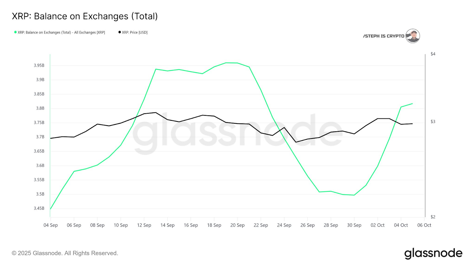 По данным Glassnode, за последнюю неделю на крупные криптовалютные биржи поступило более 320 млн XRP на сумму около 950 млн долларов. Этот приток средств поднял общий баланс бирж до более чем 3,8 млрд XRP, возобновив споры о том, готовятся ли «киты» к продаже или готовятся к следующему этапу сезона альткоинов 2025 года.
