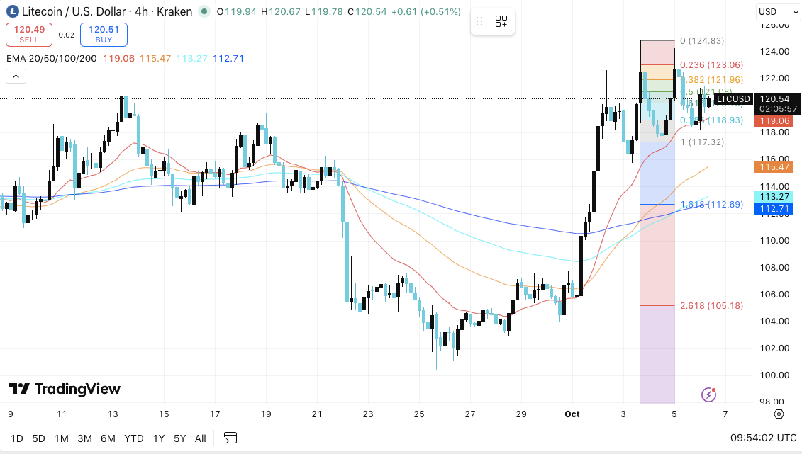 Лайткоин (LTC) сохранил бычий настрой на 4-часовом графике, несмотря на временную задержку, вызванную задержкой с решением по спотовому ETF Litecoin от Canary Capital. Токен торговался около $120,54, что свидетельствует о стабильности, даже несмотря на переоценку краткосрочных ожиданий трейдеров.