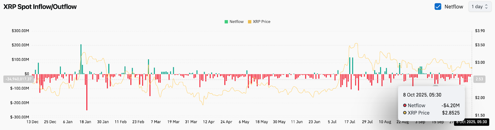 Данные биржи Coinglass показывают умеренный чистый отток в размере 4,2 млн долларов США 8 октября, что свидетельствует об умеренном накоплении на фоне низкой волатильности. Эта тенденция следует за серией контролируемых оттоков до начала октября, отражая скорее осторожное накопление, чем масштабную продажу.