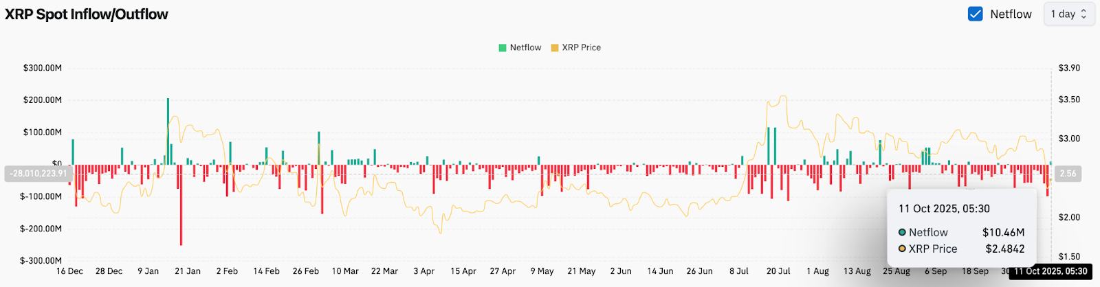 Данные о валютных потоках показывают чистый приток в размере 10,46 млн долларов США 11 октября после нескольких дней активного оттока. Это изменение указывает на то, что краткосрочные трейдеры начинают возвращаться на рынок после распродажи. Однако масштабы остаются скромными по сравнению с оттоком в размере 28 млн долларов США, наблюдавшимся в конце сентября.