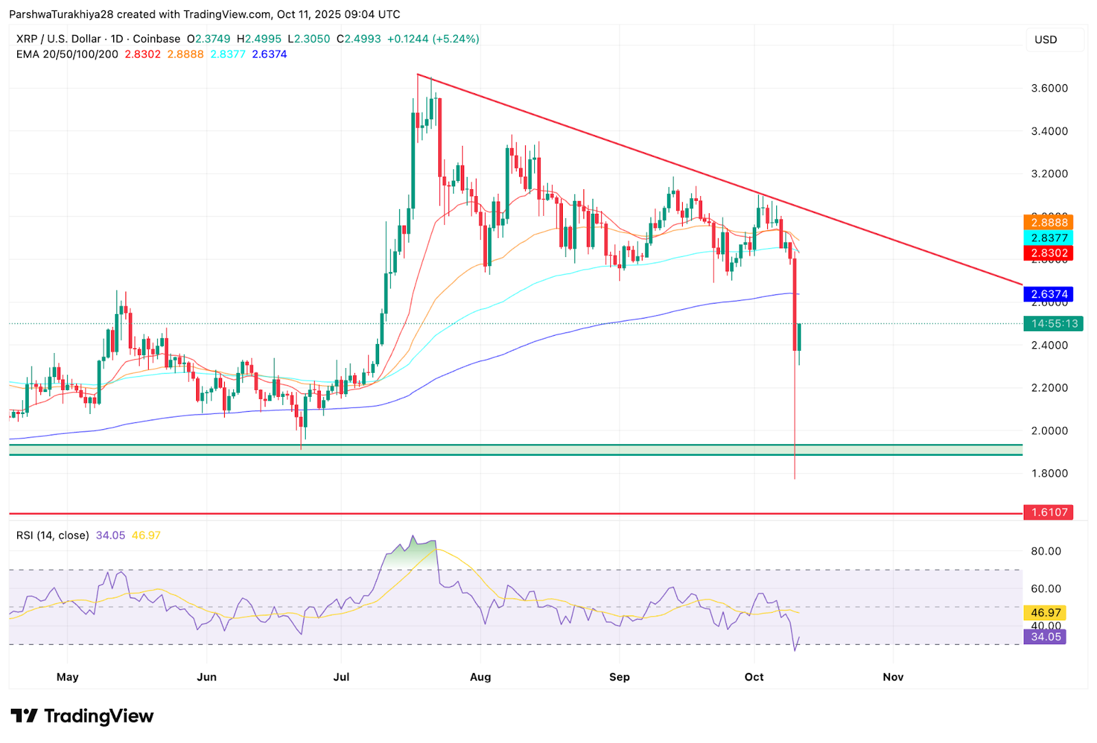 - XRP торгуется около $2,49 после падения на 42% до $1,64, что стало одним из самых резких падений за один день.