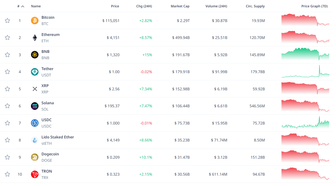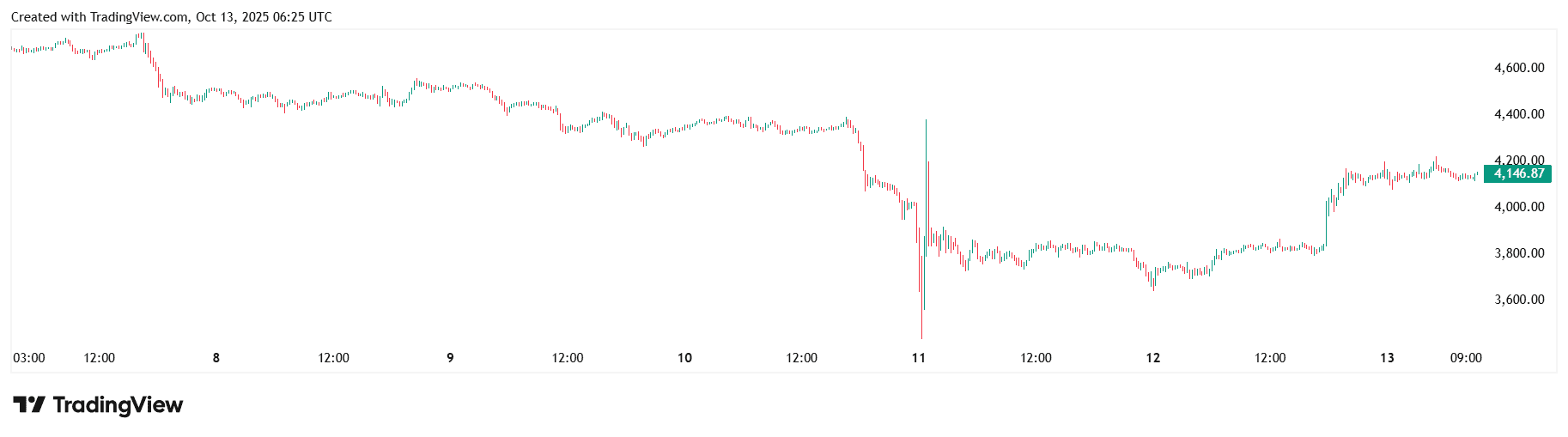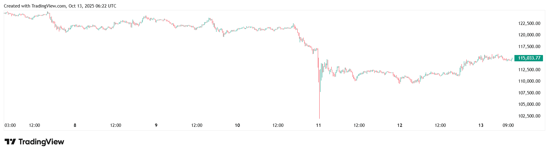 В ночь на 13 октября 2025 года курс биткоина восстановился до уровня выше $115 000, Ethereum — $4100, согласно TradingView. Это произошло после резкой коррекции и последующей волны ликвидаций на $19 млрд.