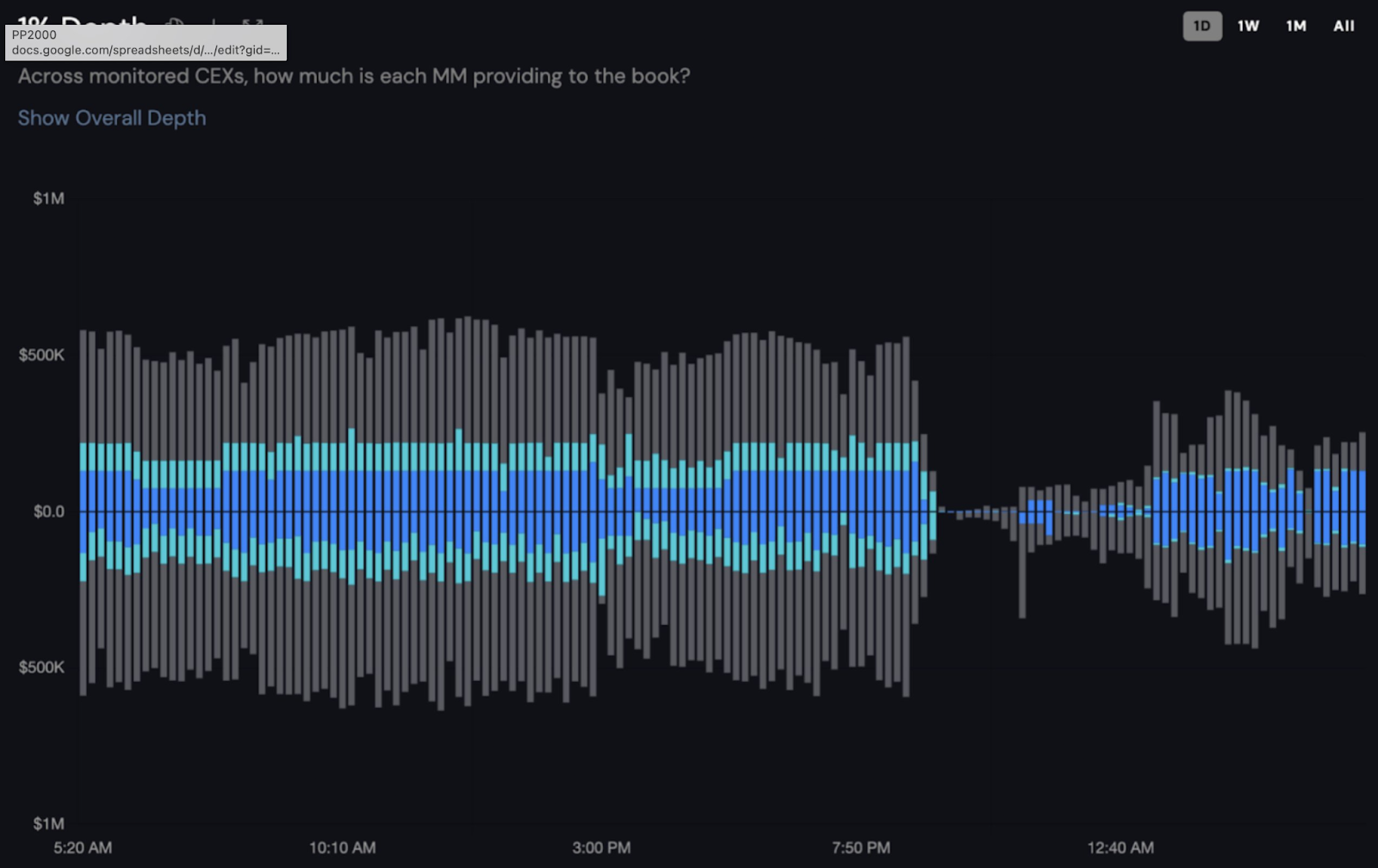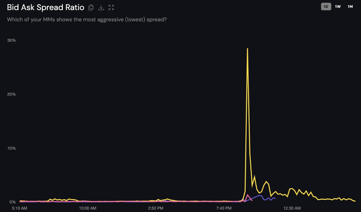 «Когда цена [одного из] токенов рухнула, оба [неназванных] маркетмейкера вывели все из стаканов. Через 1,5 часа помеченный голубым цветом снова включил своих ботов и вернулся к предоставлению ликвидности в тех же объемах, что и раньше. В то же время, помеченный бирюзовым цветом «числится» в книге ордеров, но практически не участвует в торгах», — сообщили в Coinwatch.