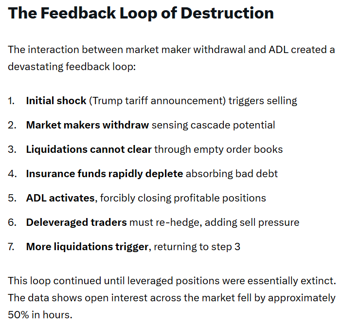 В тот день эта группа участников торгов начала снимать ордера в 21:00 UTC, через час после угрозы президента США Дональда Трампа повысить пошлины против Китая. Их уход привел к активации биржевого механизма автоматического сокращения левериджа (Auto-Deleveraging, ADL).