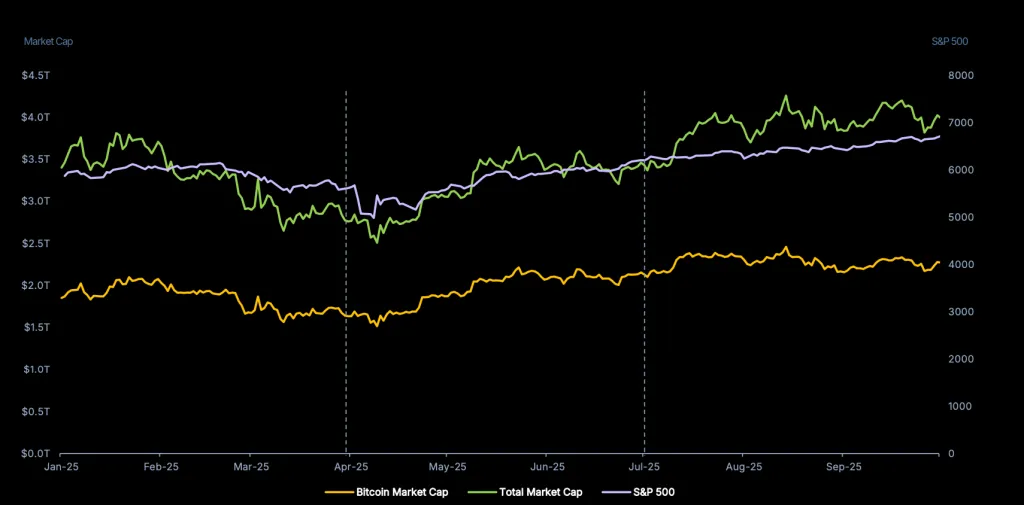 Аналитики зафиксировали снижение корреляции между биткоином и индексом S&P 500 с 0,9 до нуля. При этом остальные цифровые активы сохранили умеренно высокую зависимость от фондового индекса — 0,68 против 0,88 ранее.