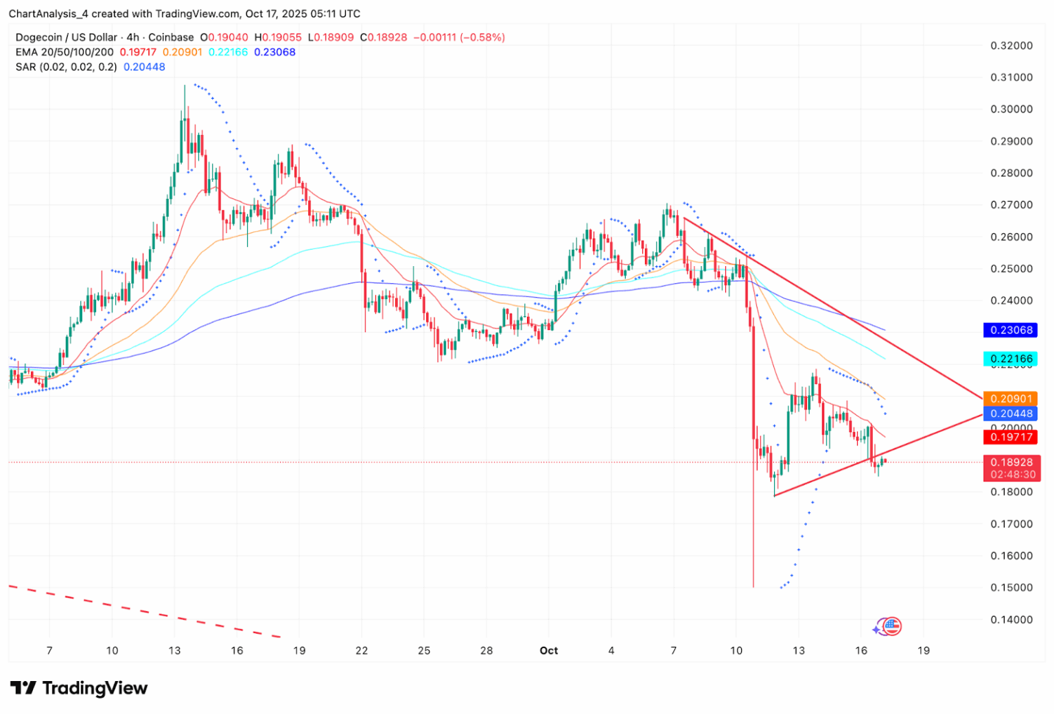 Цена DOGE остаётся в пределах нисходящего треугольника на 4-часовом графике, где повторяющиеся более низкие максимумы продолжают сдерживать восходящий импульс. 20-дневная экспоненциальная скользящая средняя (EMA) находится вблизи отметки $0,197, пересекаясь с краткосрочным уровнем сопротивления, в то время как 50-дневная экспоненциальная скользящая средняя (EMA) на уровне $0,209 и 100-дневная экспоненциальная скользящая средняя (EMA) на уровне $0,221 образуют зону плотного предложения. Выше неё 200-дневная экспоненциальная скользящая средняя (EMA) на уровне $0,2306 представляет собой последнее препятствие перед устойчивым прорывом.