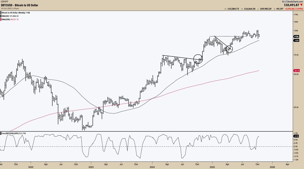 Аналитик Captain Faibik подчеркнул, что на недельном графике цифровое золото формирует «восходящий клин» — фигуру, которая часто предшествует развороту вниз. Ее расчетная цель — $52 200.