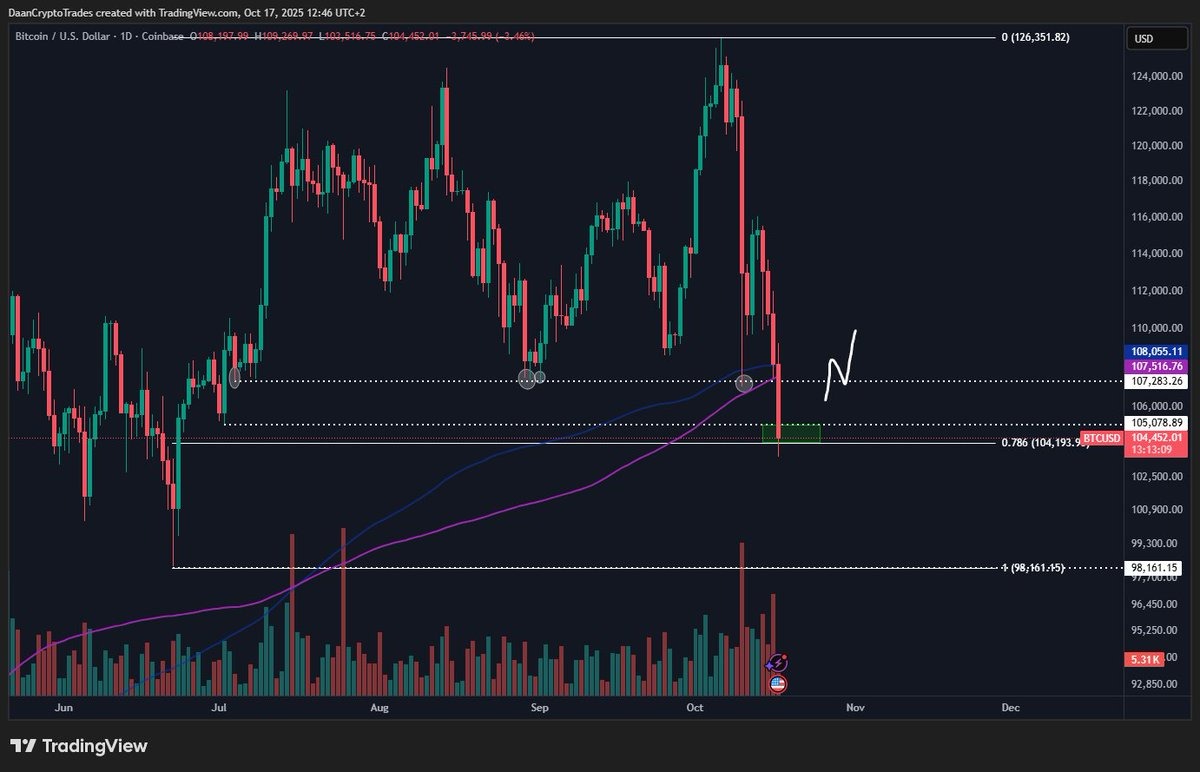 Аналитик Daan Crypto Trades отметил, что первая криптовалюта тестирует уровень Фибоначчи 0,786 около $104 000. Потеря этого уровня может вернуть цену к июньским минимумам в $98 000.