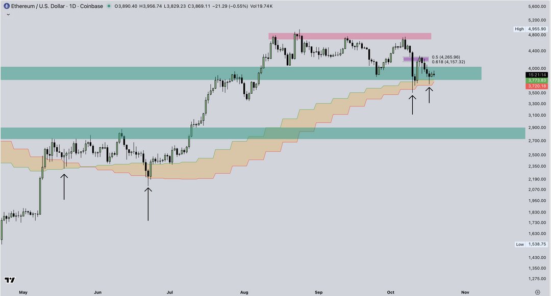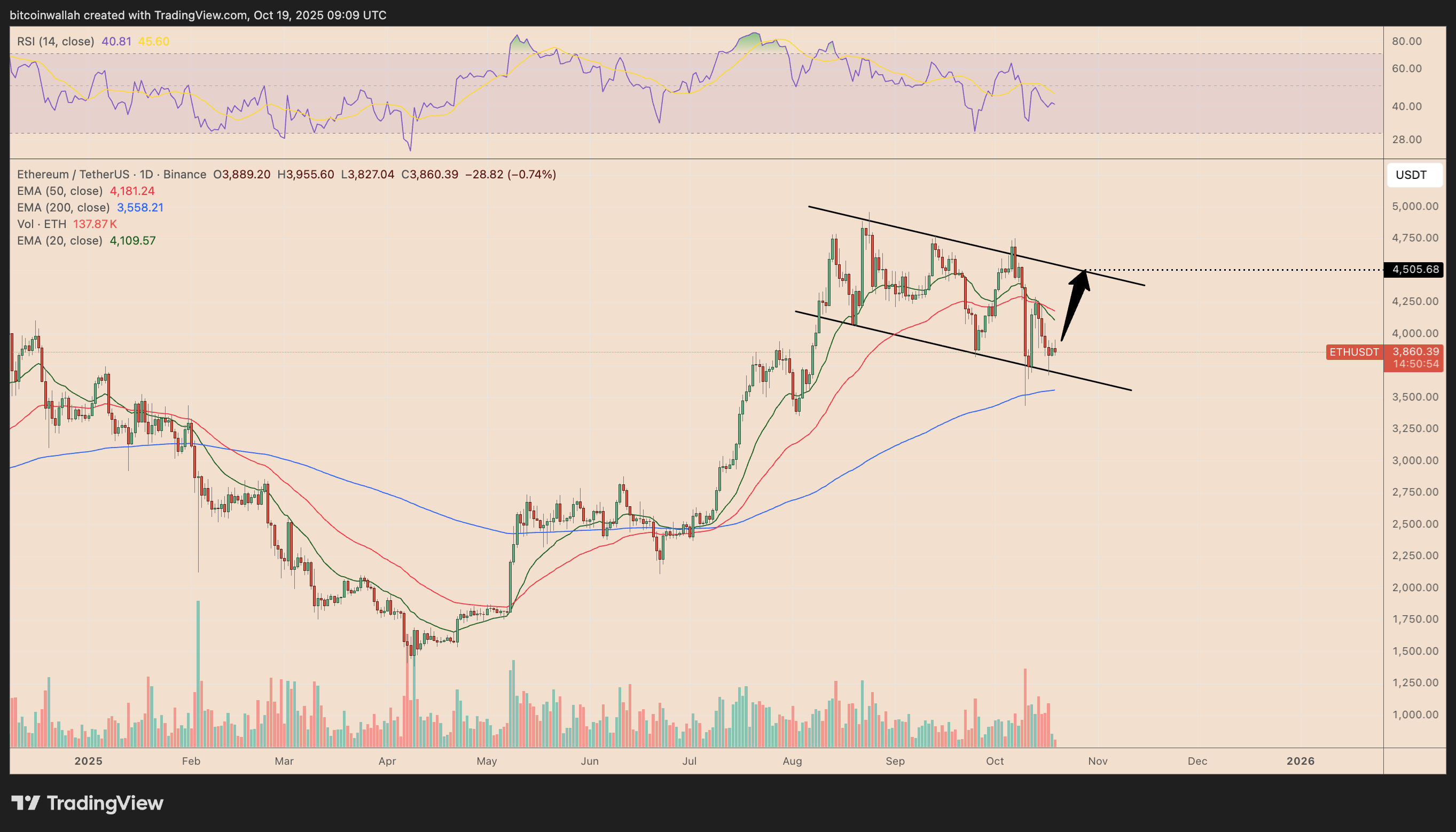 Новый импульс вниз на графике Ethereum (ETH) с 13 по 17 октября не привел к возврату к двухмесячному минимуму у ~$3435.