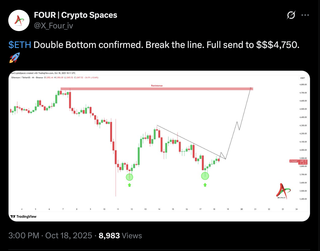 Промежуточная цель роста согласуется с моделью двойного дна, которая предполагает движение к сопротивлению на $4300 и в случае его прорыва к $4750. На эту фигуру обратил внимание аналитик под ником FOUR.